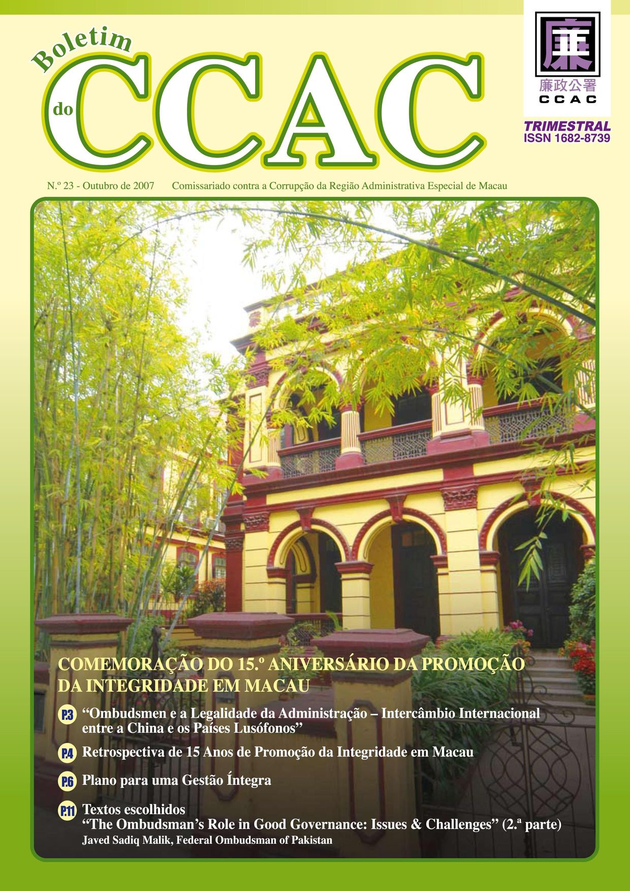 Em 2007 completam-se 15 anos da promoção da integridade social em Macau, facto que o Boletim não pode deixar de assinalar. O artigo "Retrospectiva de 15 anos de promoção da integridade em Macau" apresenta um resumo das acções desenvolvidas pela instituição de Macau contra a corrupção, desde a sua criação em 1992, nas áreas do combate à corrupção, da provedoria de justiça, da supervisão das eleições legislativas e das relações comunitárias. Ainda no âmbito das comemorações, o CCAC promoveu o "Intercâmbio Internacional entre a China e os Países Lusófonos" sob o tema "Ombudsman e a Legalidade da Administração", para o qual foram convidados representantes de vários países de língua portuguesa e de Hong Kong, para troca de experiências. Esse evento merece um lugar de destaque no presente número do Boletim.
