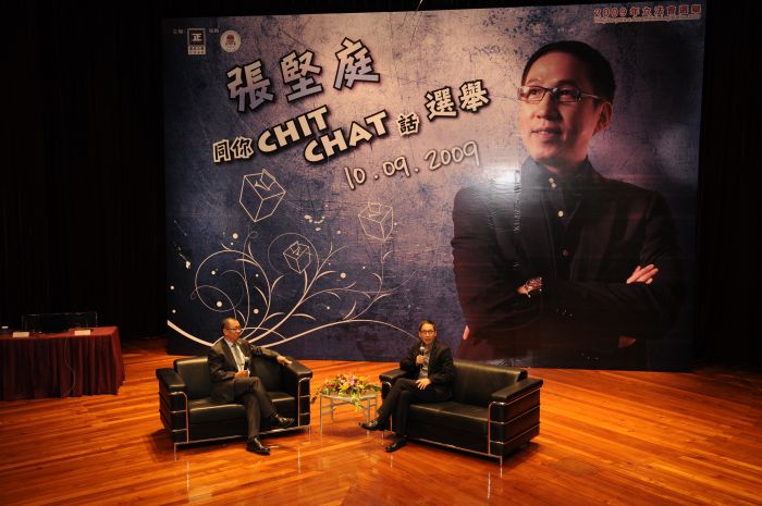 廉政公署於9月10日下午4时假澳门大学文化中心举行名为「张坚庭同你chit chat话选举」活动,邀请香港着名导演张坚庭莅澳,透过轻松互动的方式,与本澳大专院校学生对话,就年青人行使公民权利、议会和社会的关系、青年和参与议会政治等问题分享经验和意见。活动吸引逾600名年青人参加,气氛热烈。