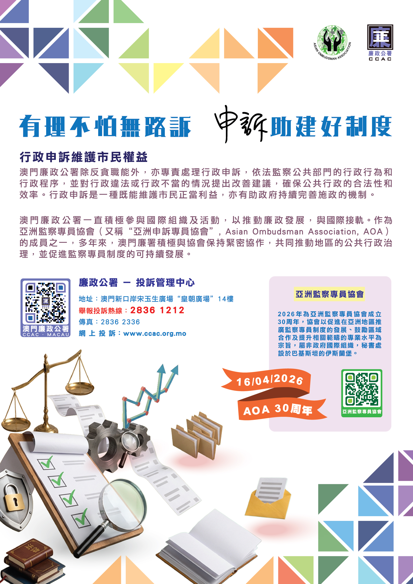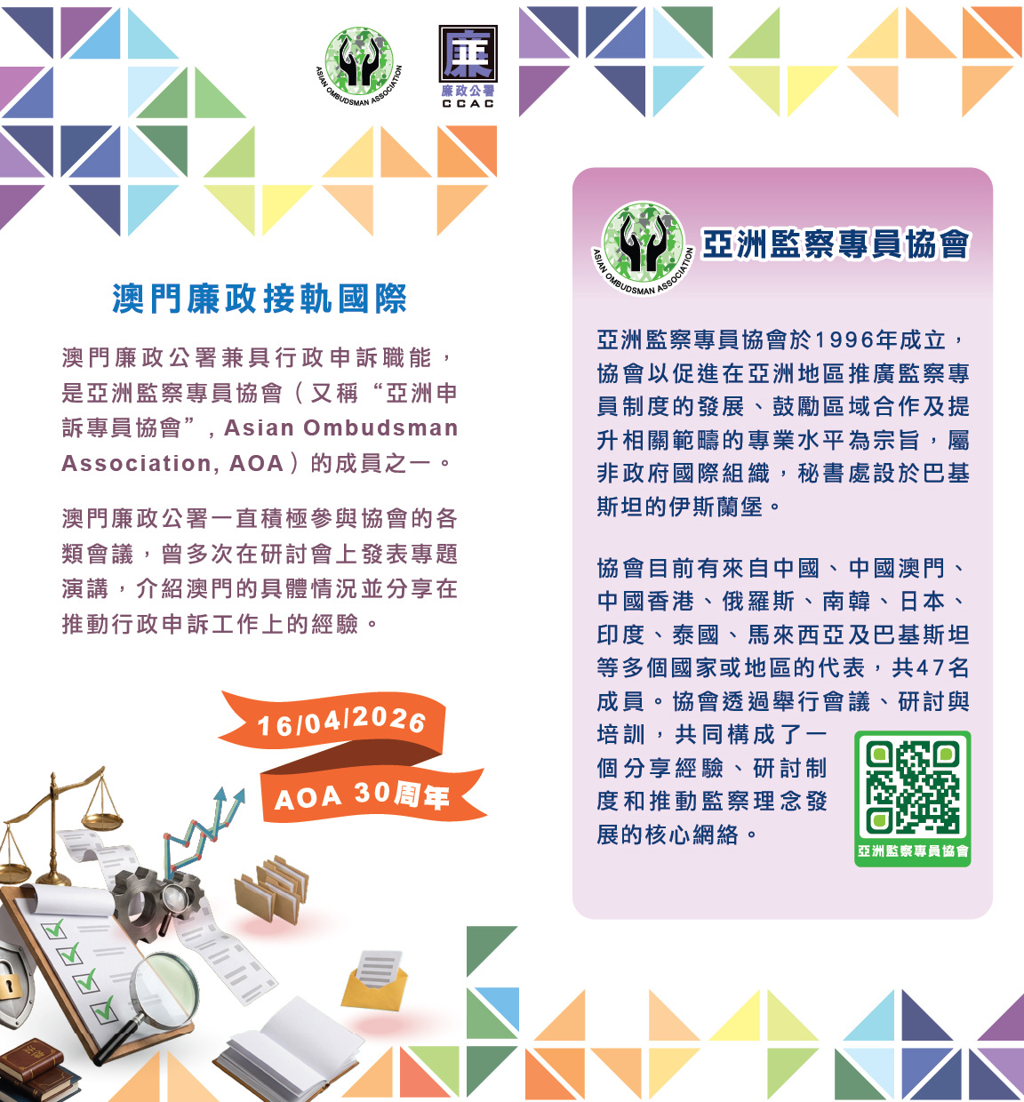 亞洲監察專員協會將於2026年4月16日慶祝成立30周年。更多AOA資訊,可參閱協會網頁:AOA網頁連結。