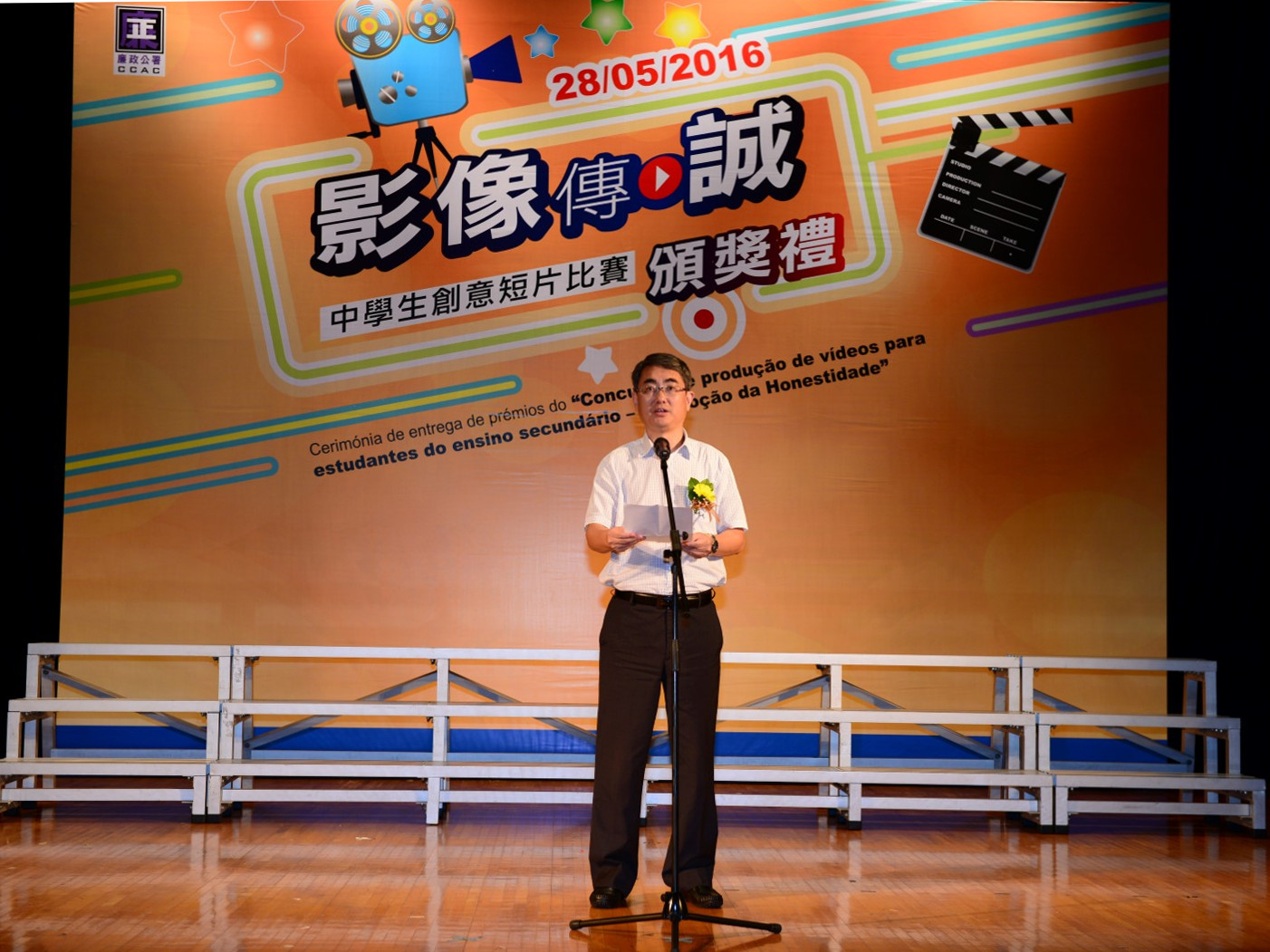 廉政公署“影像傳誠”中學生創意短片比賽頒獎禮今天(5月28日)於中葡職業技術學校禮堂舉行,廉政專員張永春致辭時表示,廉政公署一向重視青少年廉潔及誠信教育工作。透過是次比賽,希望參賽中學生在創作過程中能反思誠信和廉潔的重要性,培養他們建立誠信守法的正確價值觀。
