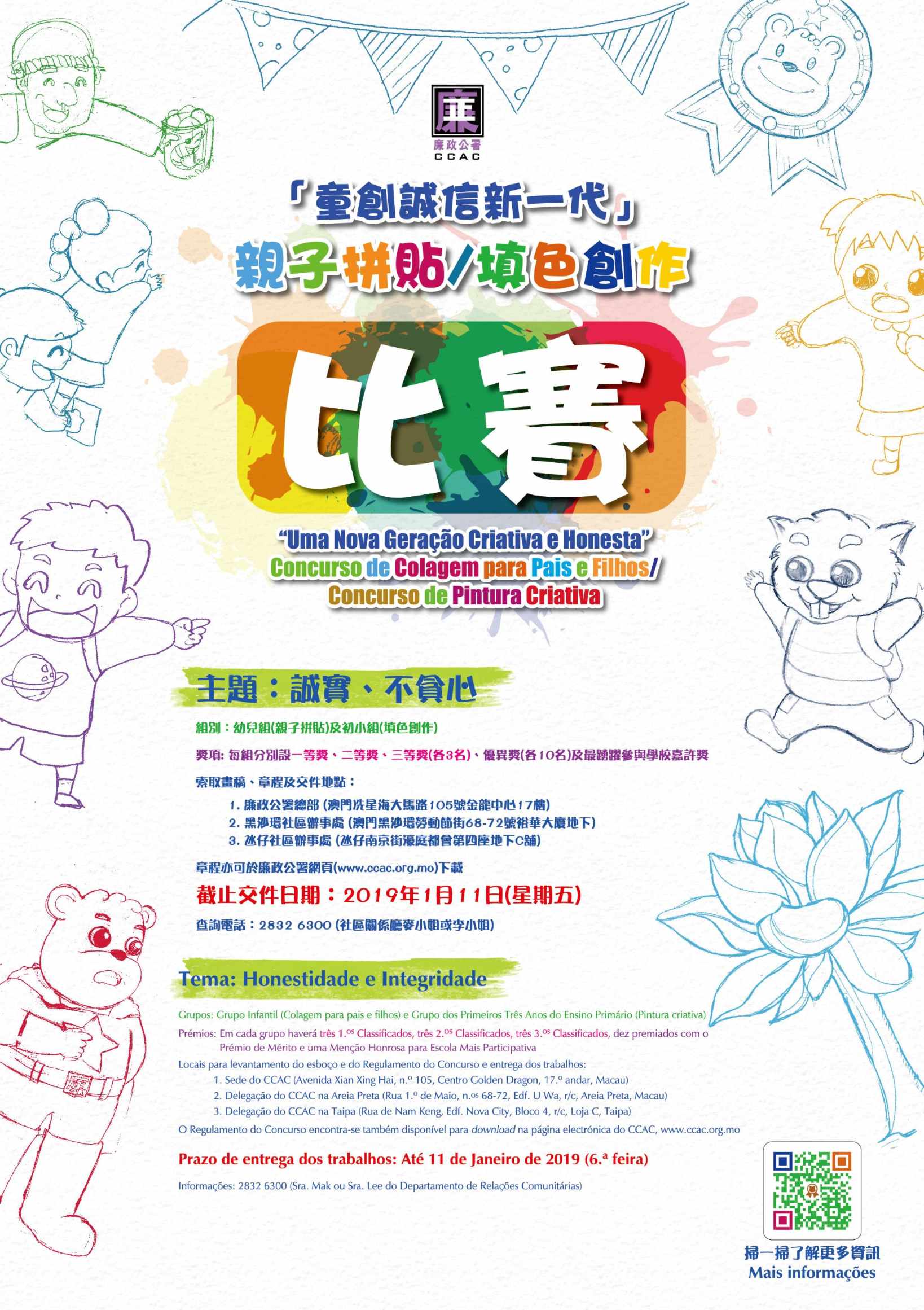 比賽章程可於廉署網頁(www.ccac.org.mo)查閱,比賽專用畫稿可於廉政公署總部、黑沙環及氹仔社區辦事處索取,每位參賽學生只可遞交1份作品,截止交件日期為2019年1月11日,得獎名單將於3月公佈。詳情可參閱比賽章程或致電2832 6300查詢。