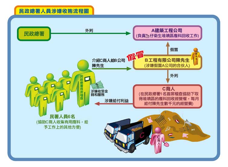 調查發現,一名民政總署首席稽查涉嫌收受兩名商人的金錢利益,違反規定安排該兩名商人向一名自稱承接堆填區工程的姓陳男子接洽,涉案商人每月給付數千元給該名姓陳男子,以便可進入堆填區收集廢鐵等物變賣。